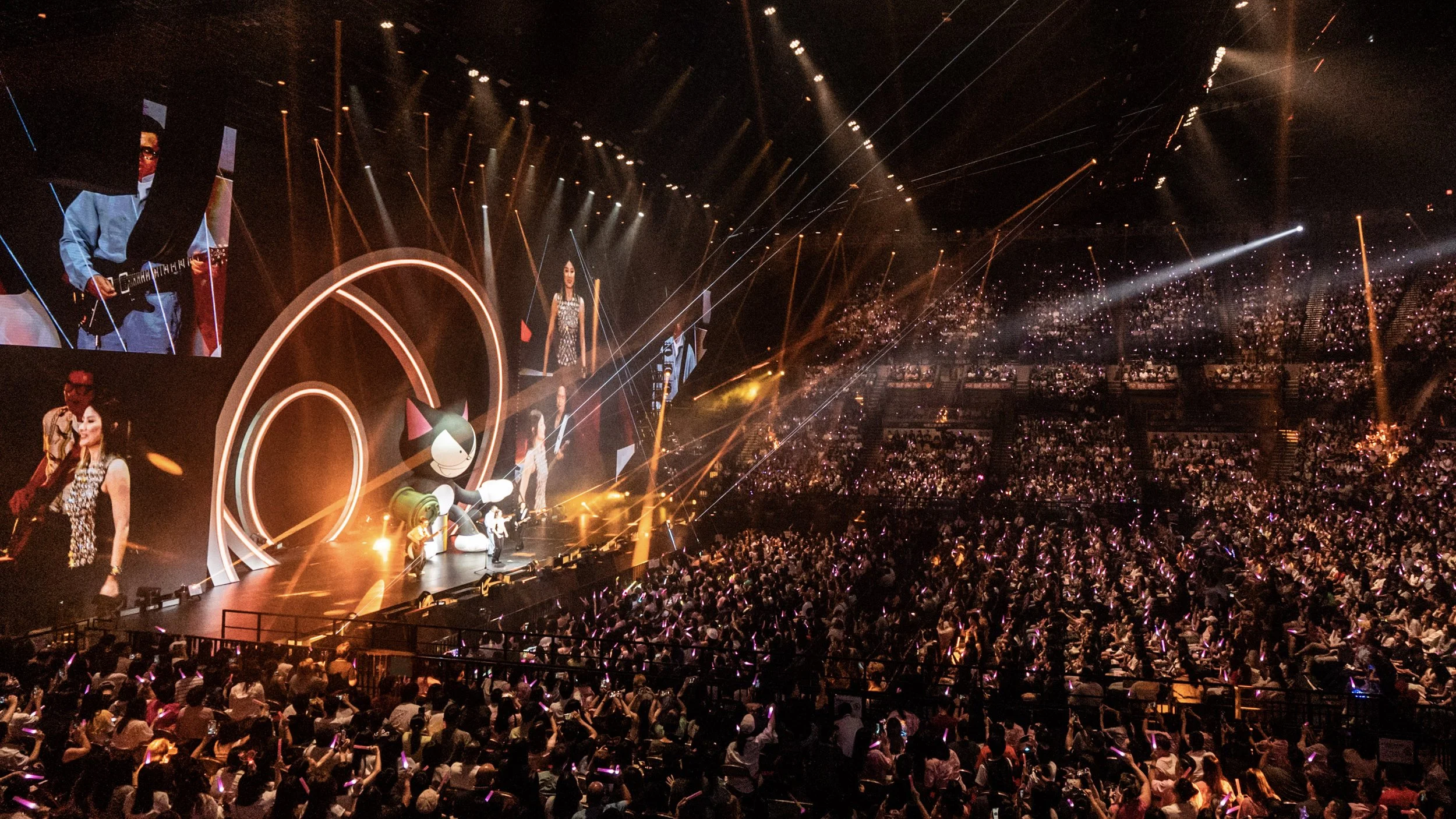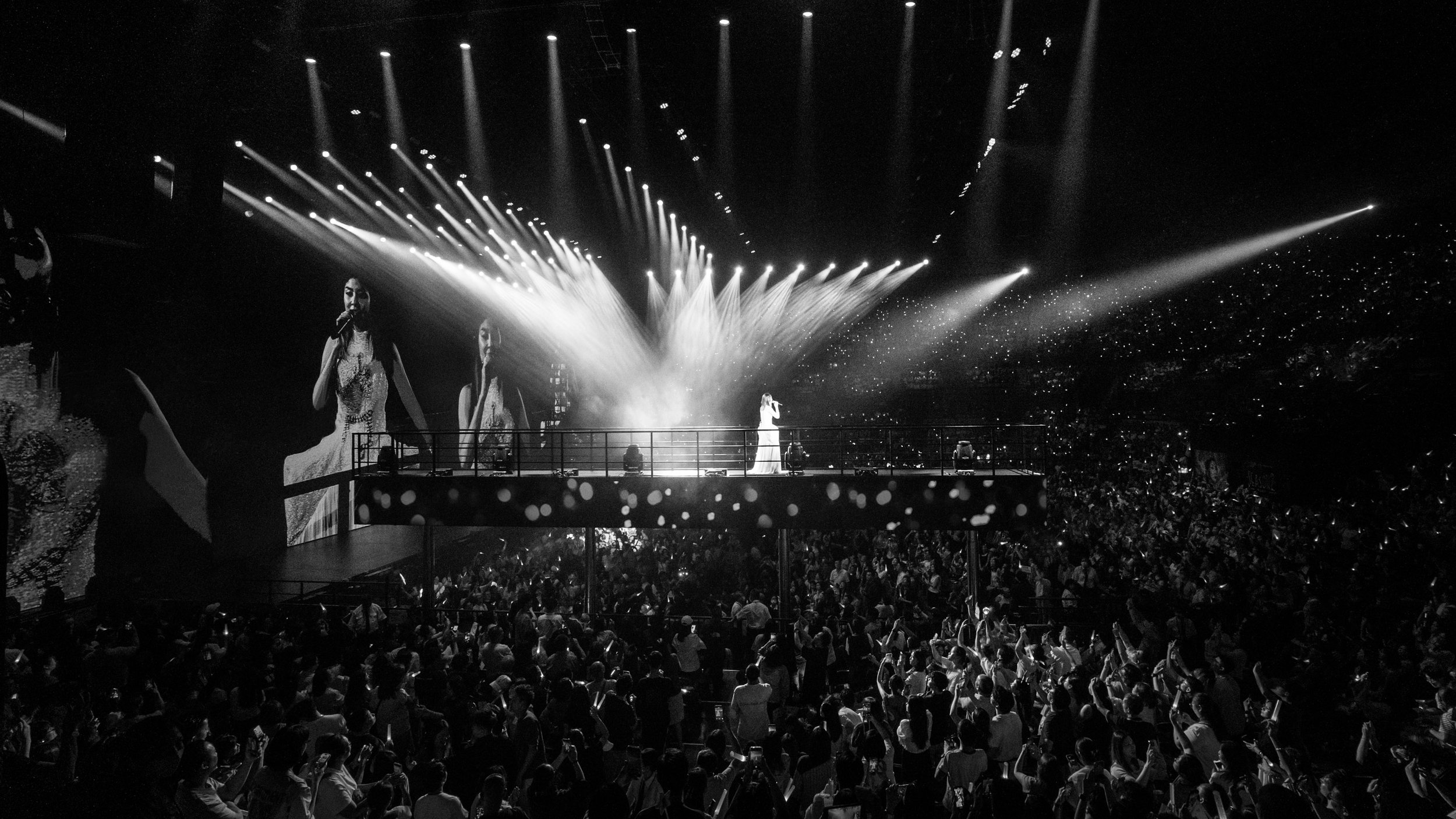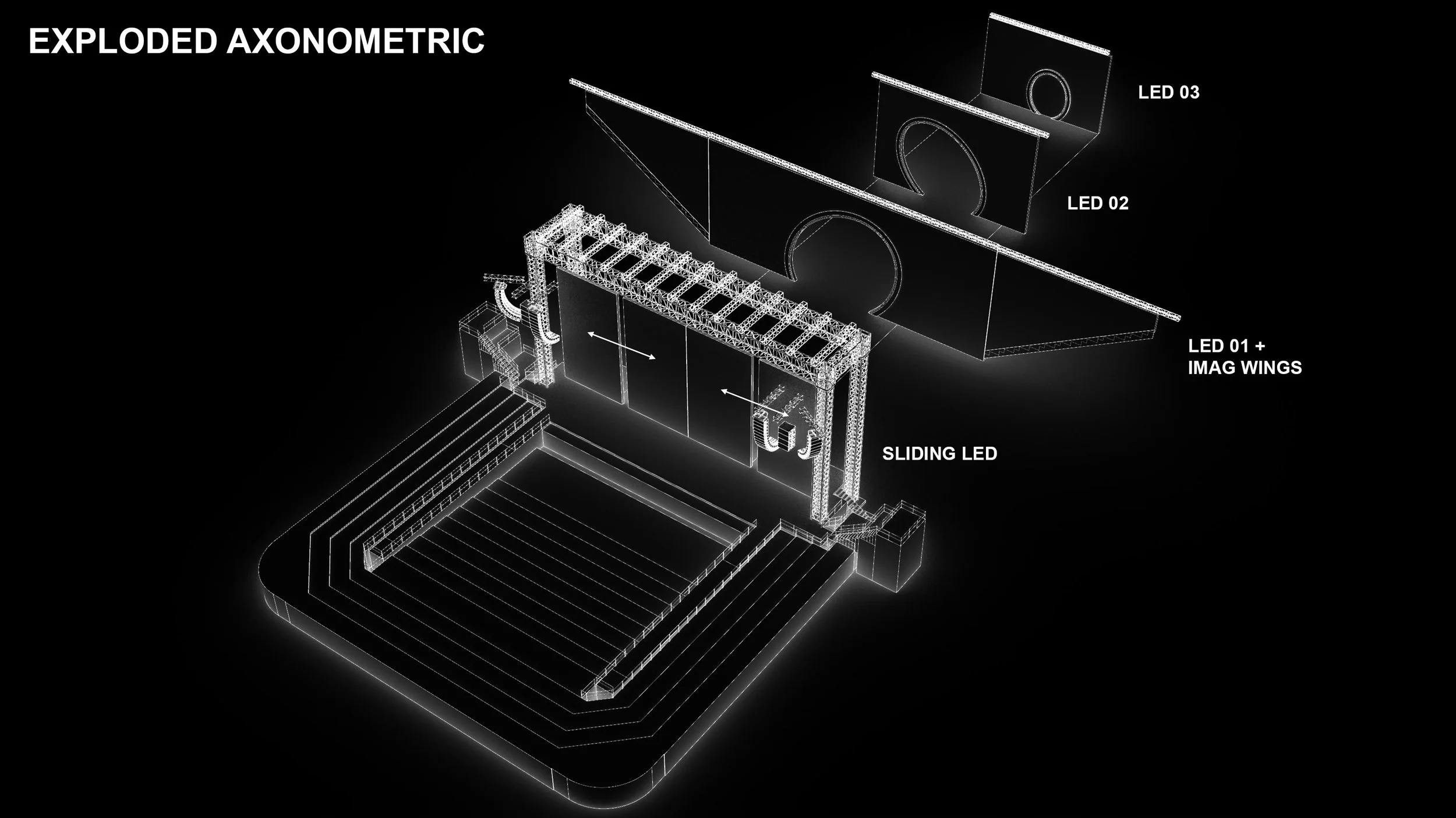 The stage is built from layered LED screens with oval cutouts at its core. A sliding LED panel reveals the shapes behind, creating moments of reveal and surprise. Two catwalks transform into elevated platforms, bringing the performance closer and making the experience more immersive for those at the back.