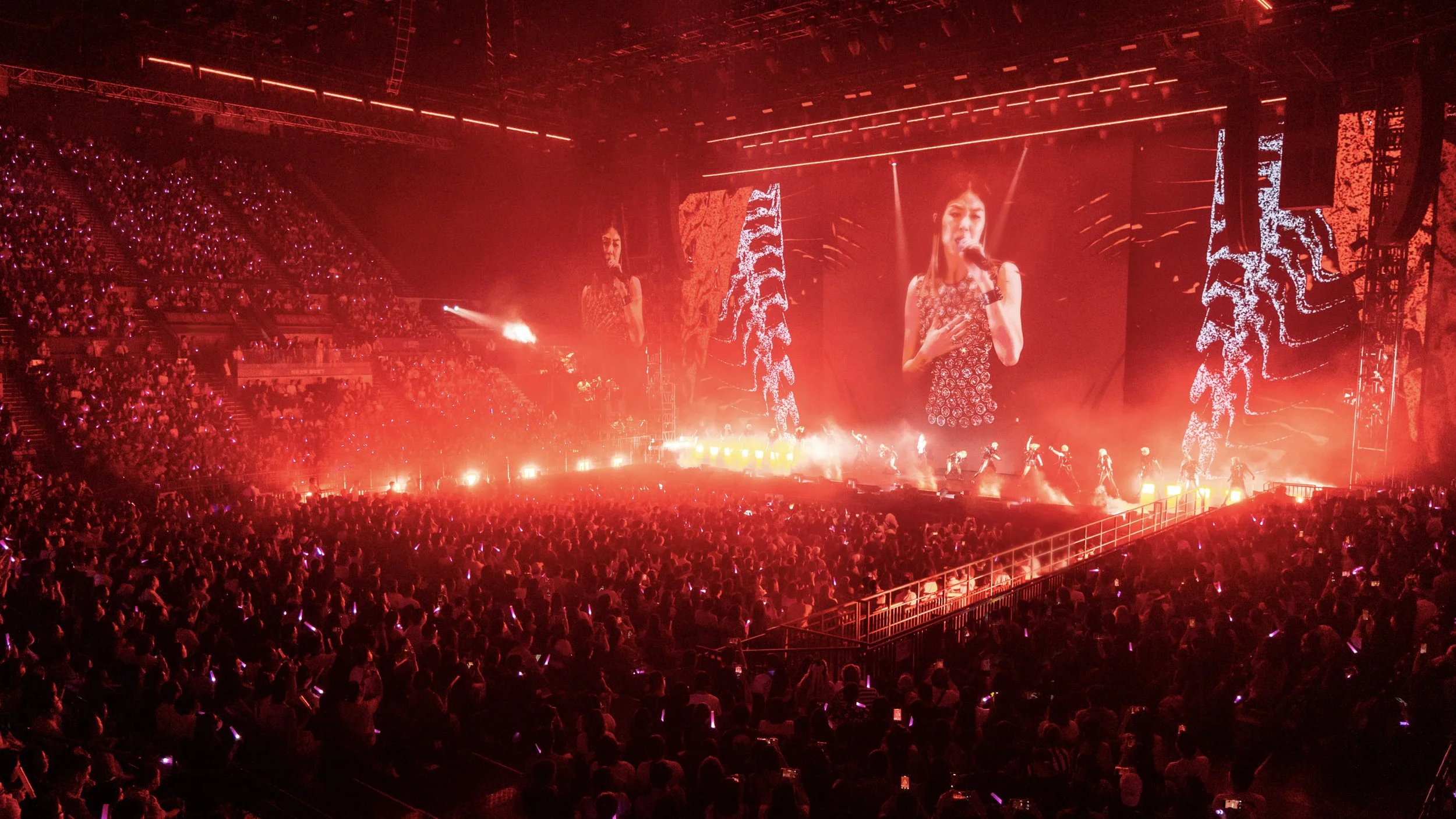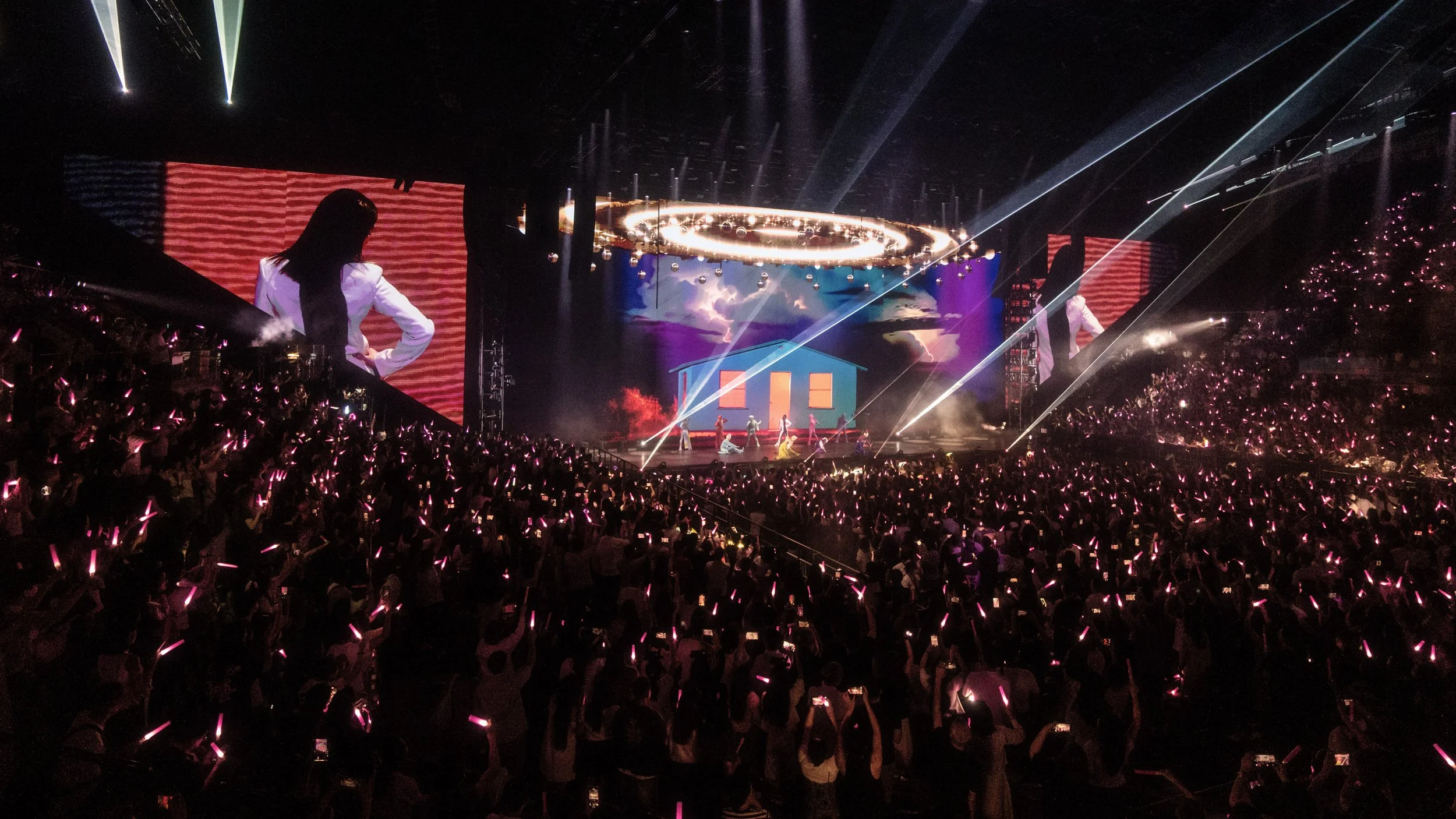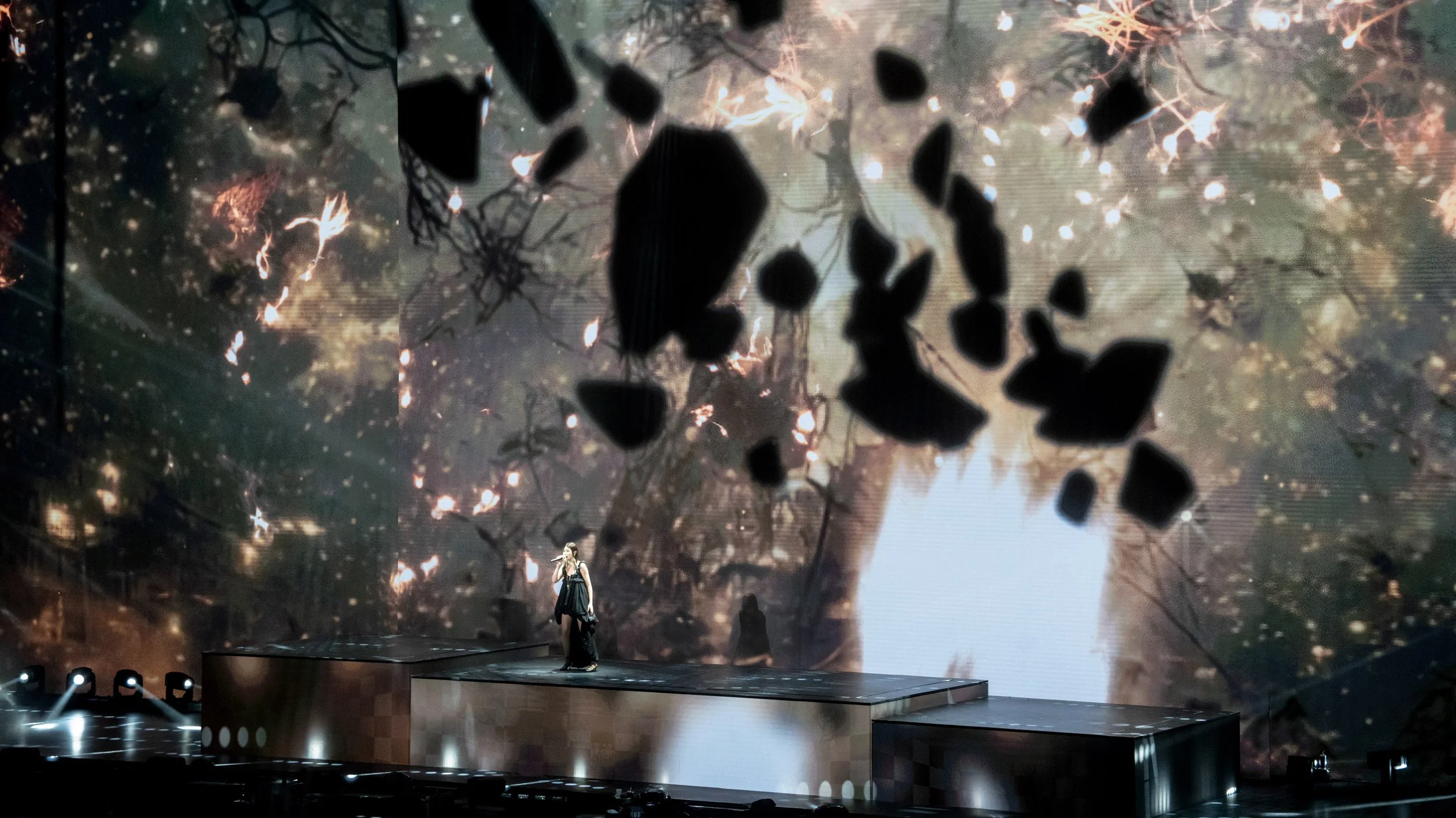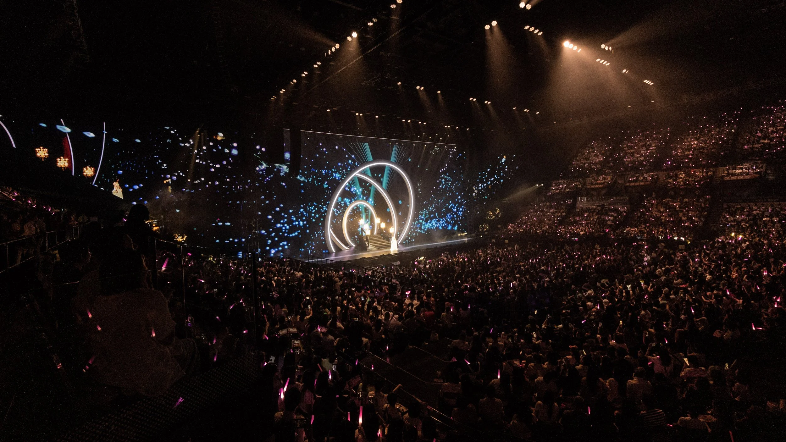 The stage is built from layered LED screens with oval cutouts at its core. A sliding LED panel reveals the shapes behind, creating moments of reveal and surprise. Two catwalks transform into elevated platforms, bringing the performance closer and making the experience more immersive for those at the back.