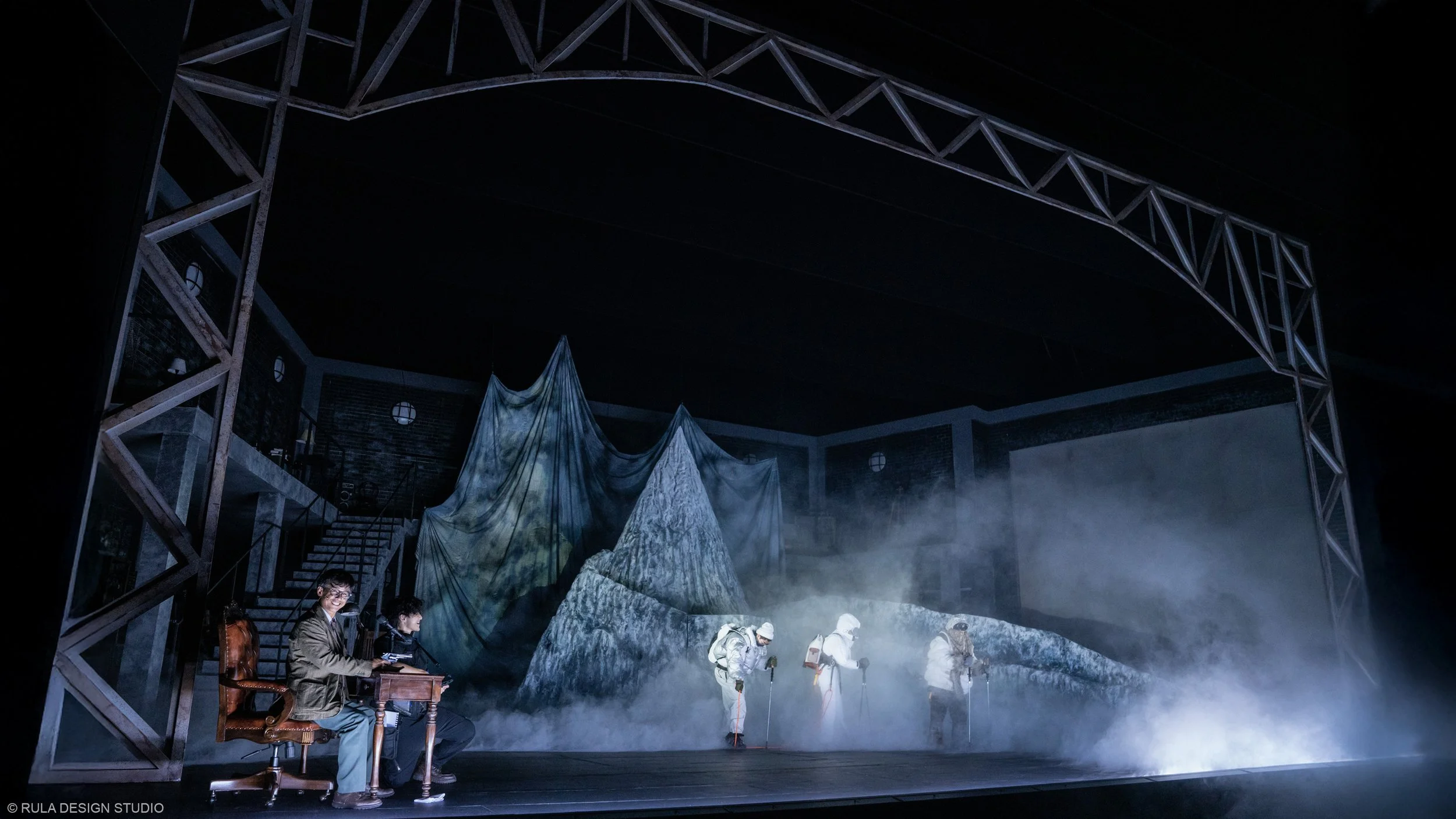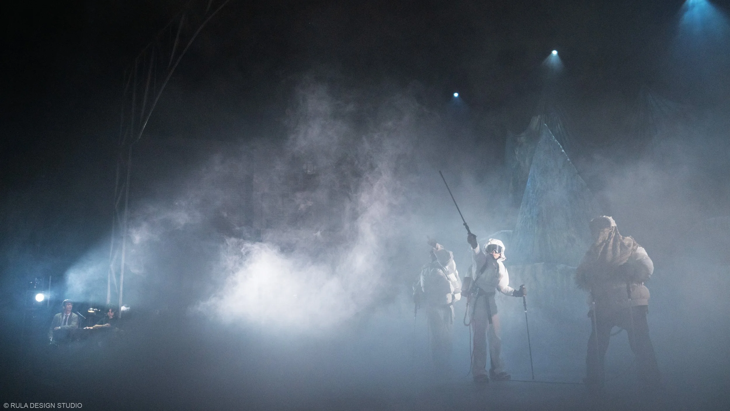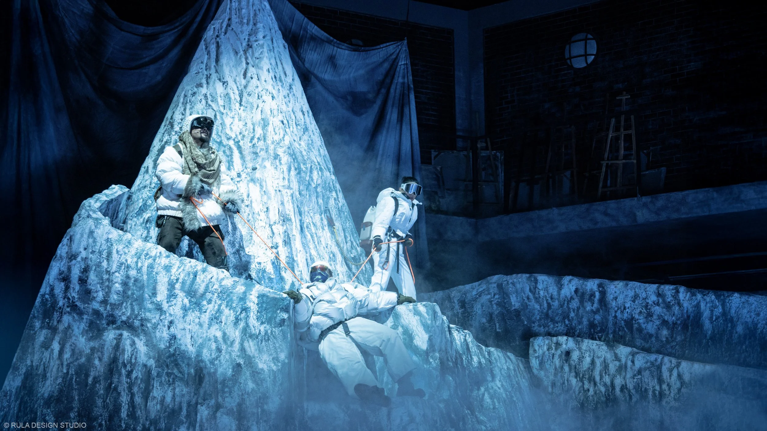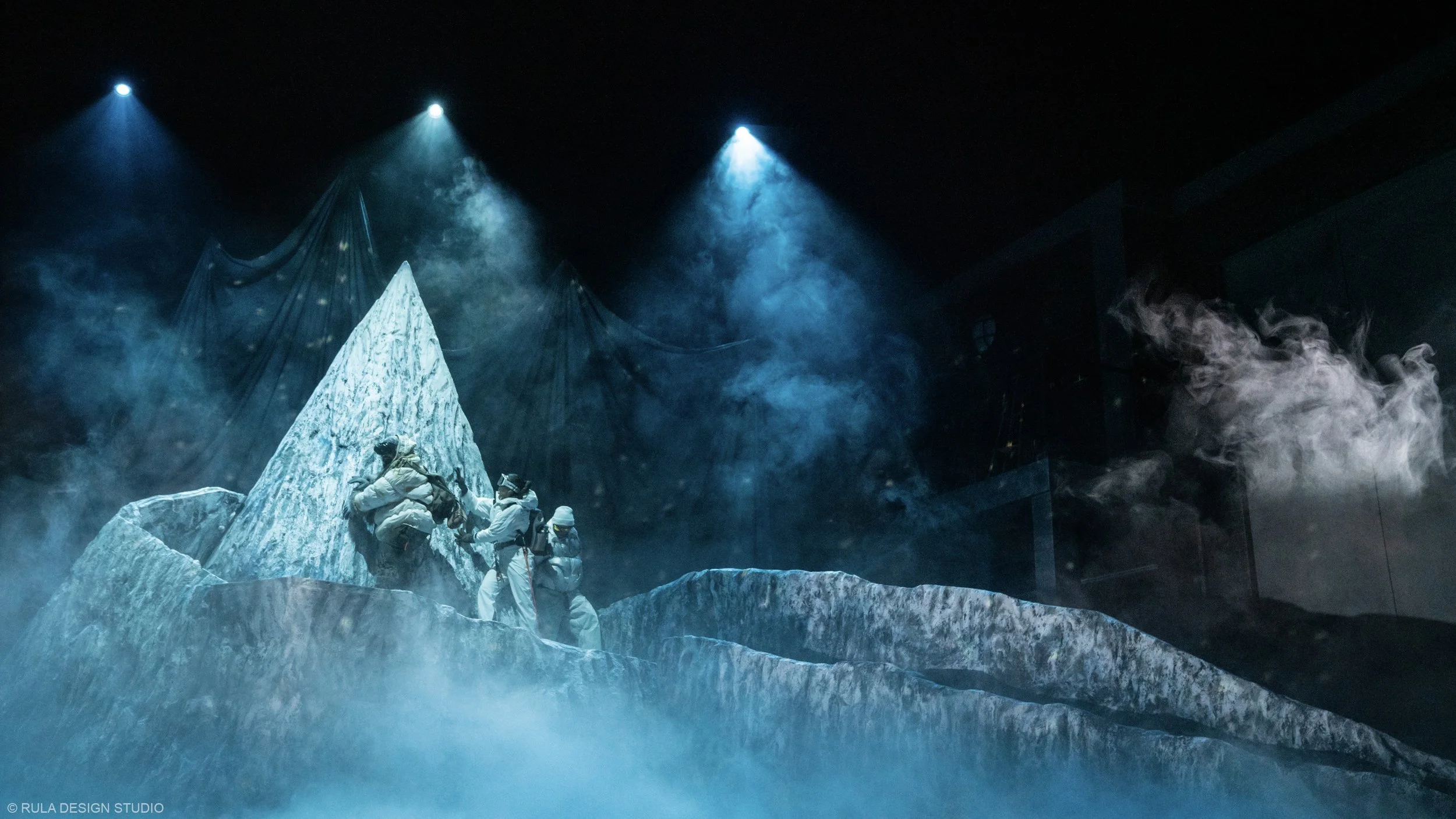 As chaos and creativity intertwine, the snow mountain begins to fall apart, revealing the theatre beneath. By the end, only the bare bones of the stage remain, a metaphorical unmasking of illusion. The design supports this journey between illusion and truth, past and present, through shifting layers of space and revealing hidden elements as the story evolves.