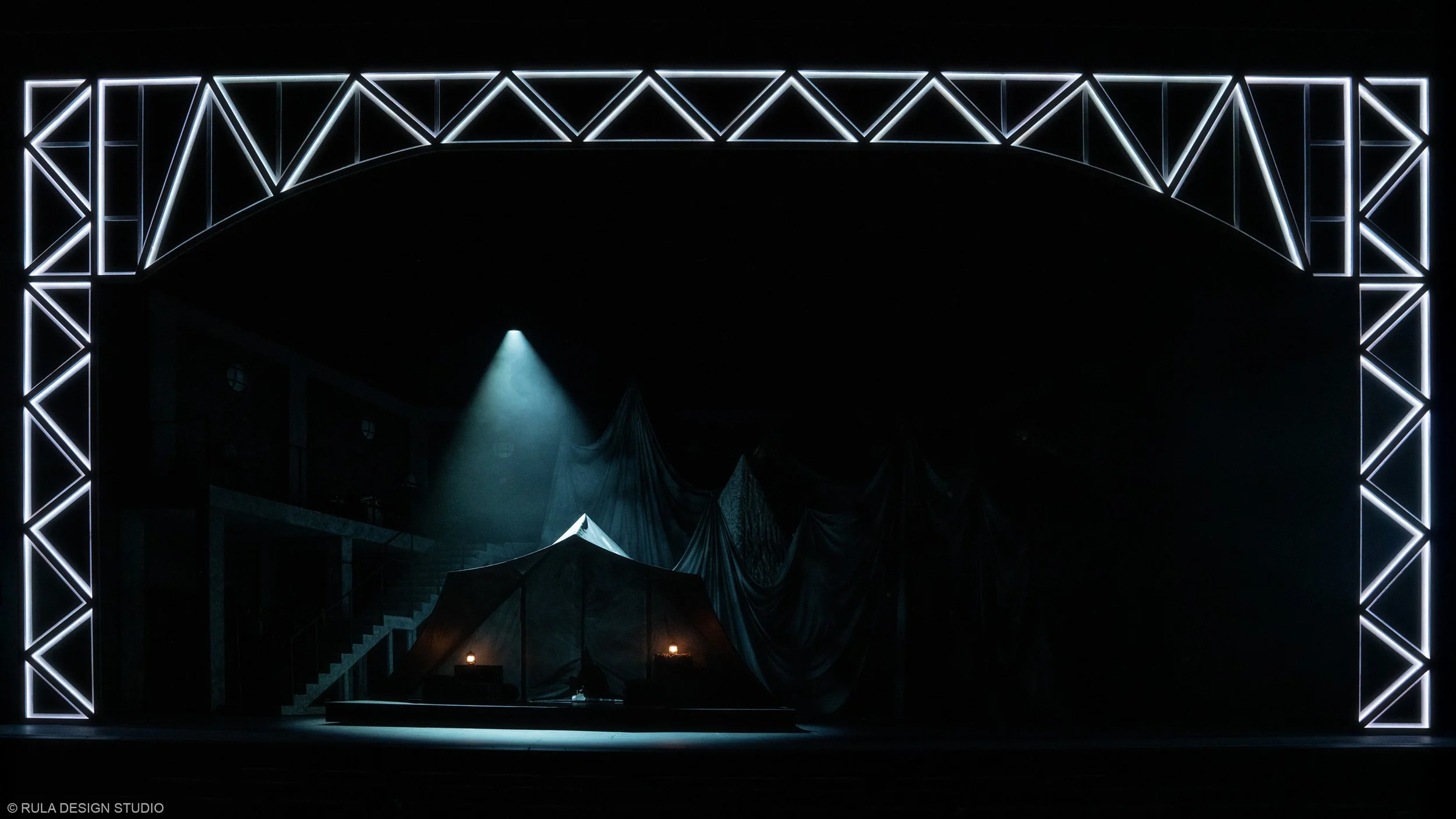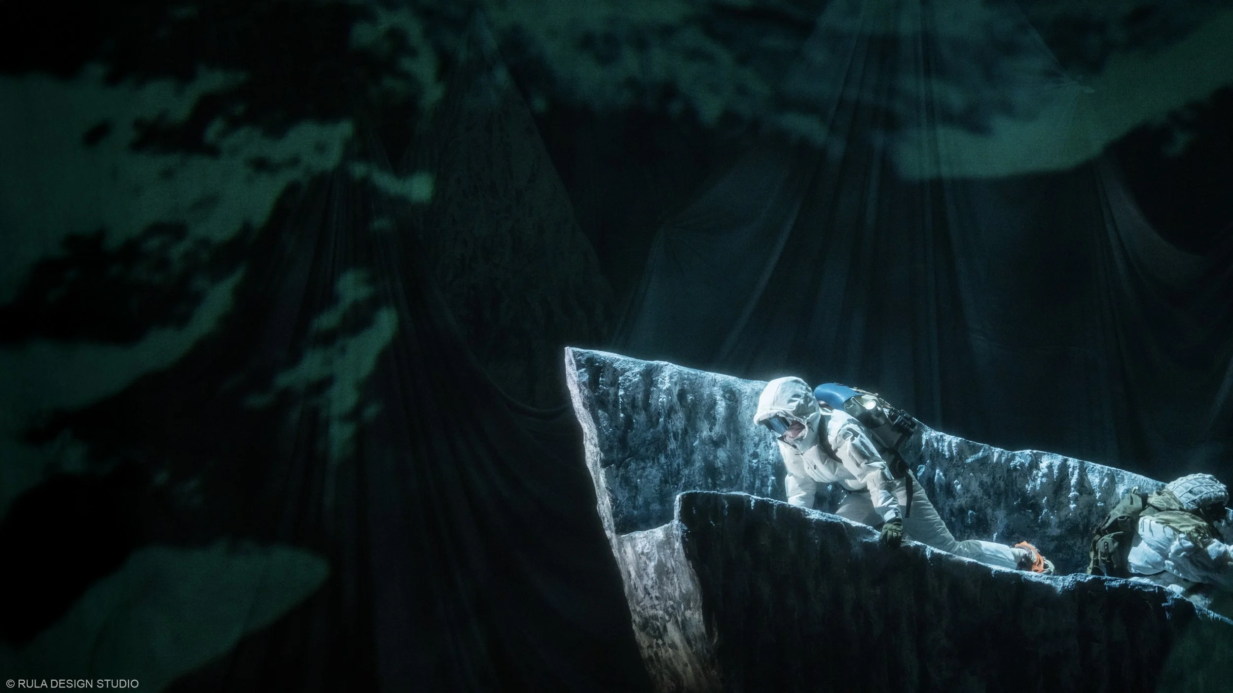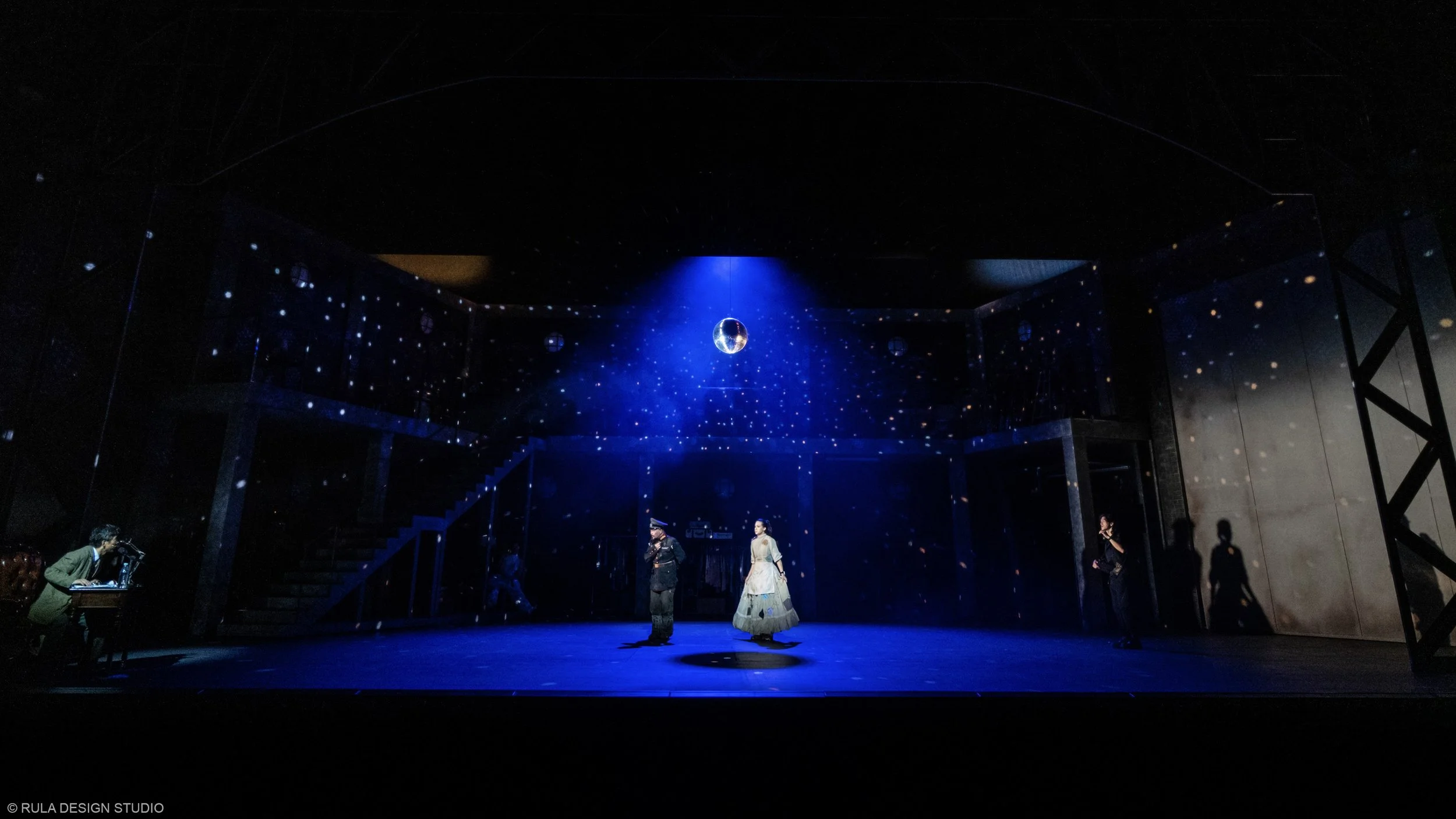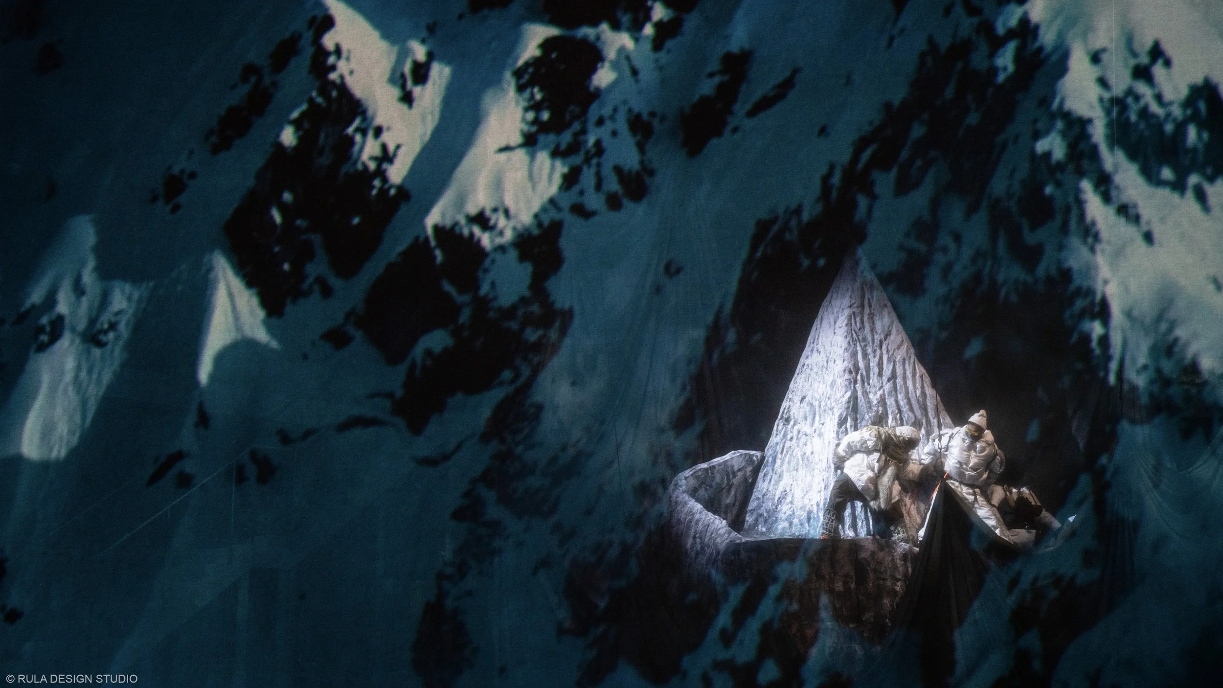 As chaos and creativity intertwine, the snow mountain begins to fall apart, revealing the theatre beneath. By the end, only the bare bones of the stage remain, a metaphorical unmasking of illusion. The design supports this journey between illusion and truth, past and present, through shifting layers of space and revealing hidden elements as the story evolves.
