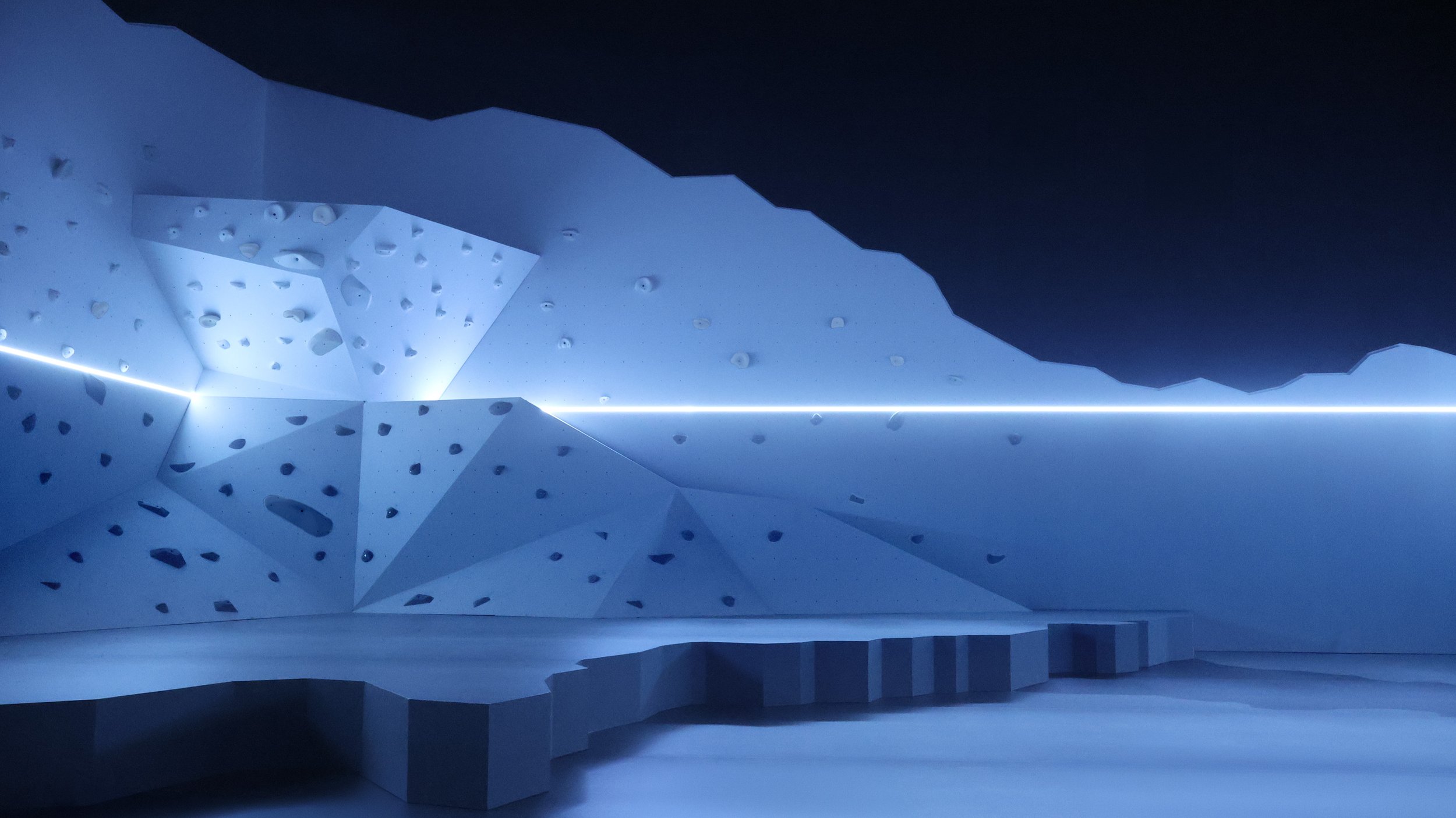 The design materialises this environmental shift through a stark, monochromatic landscape. A sharp datum line cuts across the space at two metres, marking the projected rise in sea level in a hundred years’ time. The floor fractures into layered, uneven planes, echoing melting ice sheets and breaking glaciers. Above and below this line, the space oscillates between black and white, creating a surreal, almost glacial atmosphere. Multiple levels construct a vertical ecosystem, where each species occupies a distinct yet interconnected habitat, revealing the fragile balance within nature.