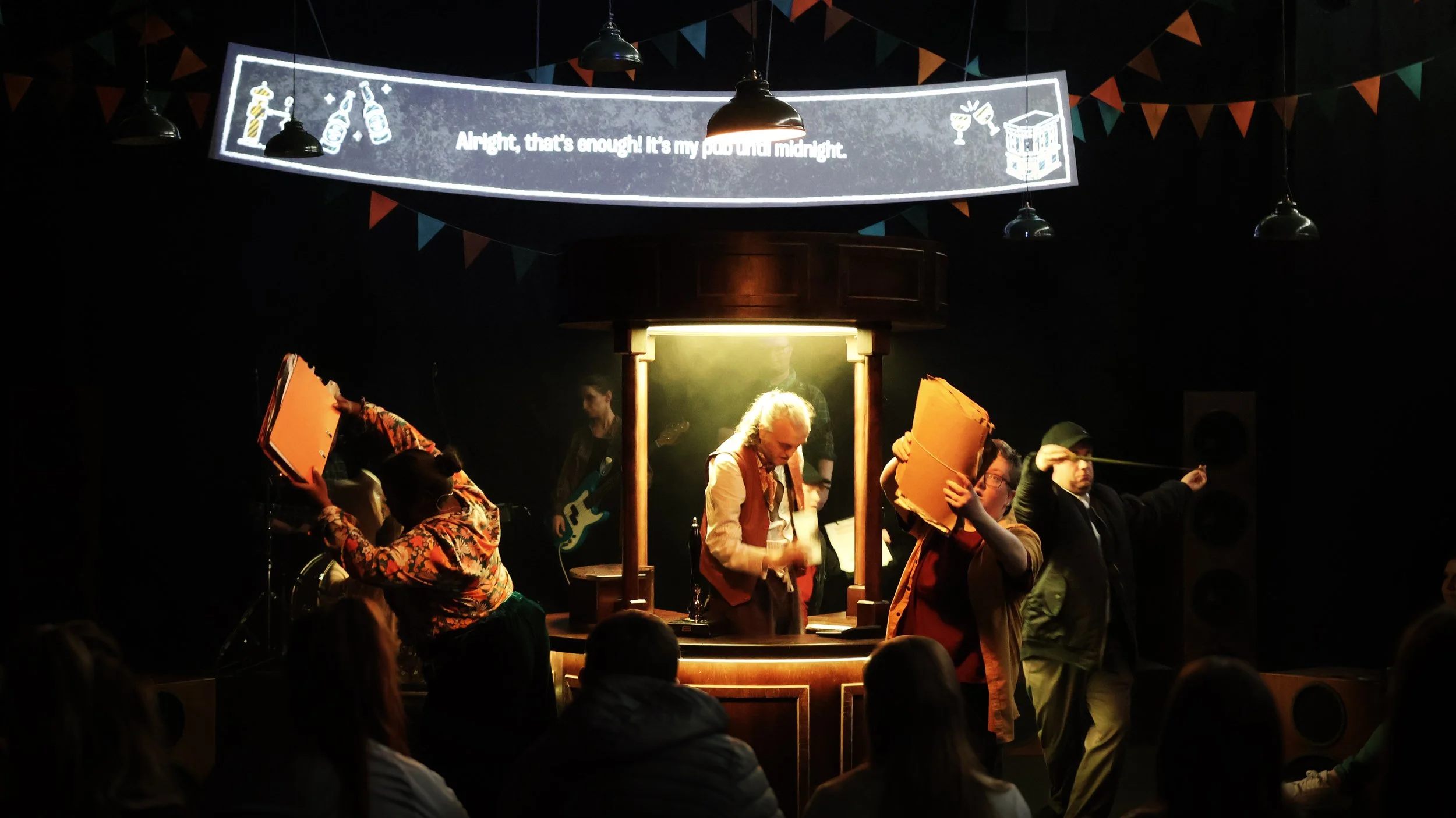 The evening began as a surprise party, with audiences welcomed into the pub, greeted by the cast, and invited to sign a birthday card for Harley, the guest of honour, who longs to disappear. A live band played from the corner stage, pendant lights hung overhead, and glowing speaker boxes surrounded the space. The concentric layout of the room created a sense of togetherness, capturing the warmth and buzz of a pub while holding the intimacy of live storytelling.